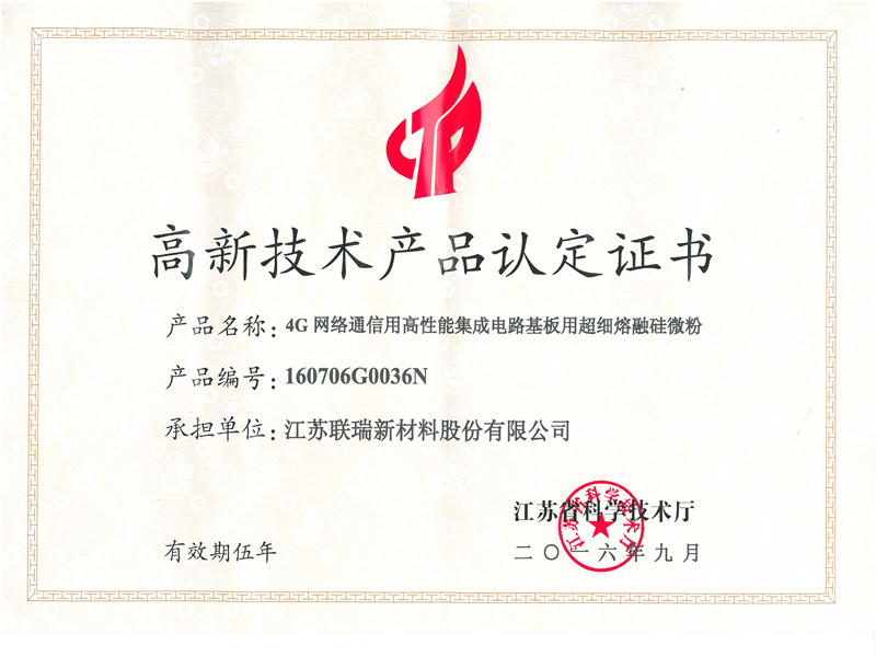 新闻中心 首页>新闻中心>新闻中心 联瑞新材研发的新产品通过江苏省高新技术产品认定 2017年02月15日 近日,联瑞新材自主研发的“4G网络通信用高性能集成电路基板用超细熔融硅微粉”产品获得“江苏省高新技术产品”认定。公司创建30多年以来始终注重自主创新,每年都会投入不低于销售收入4%的经费用于新产品和新技术的研发。此次高新技术产品的认定是公司多年来自主创新的成果,是公司具有较强研发和科研实力的真实反映,也是省科技厅等有关部门对联瑞新材多年来科研成果与科技创新能力的又一次权威认可。